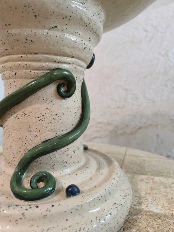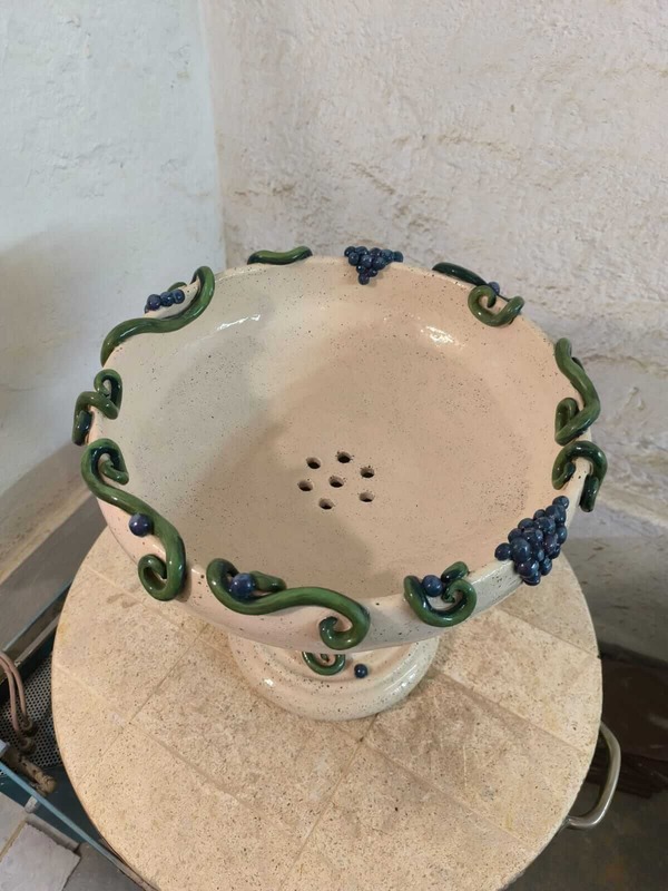 Najprej je bila oblikovana skrbno uravnotežena posoda iz šamotne gline, ki zagotavlja stabilnost in trajnost, zatem pa so bili dodani še ročno modelirani detajli trte, vitic in grozdov ter barvani z engobami, ki ustvarijo naraven, živahen in rustikalen videz. Po sušenju in prvem žganju je bila nanešena še zaključna glazura, ki varuje barve in loncu daje rahlo sijajen, eleganten zaključek.